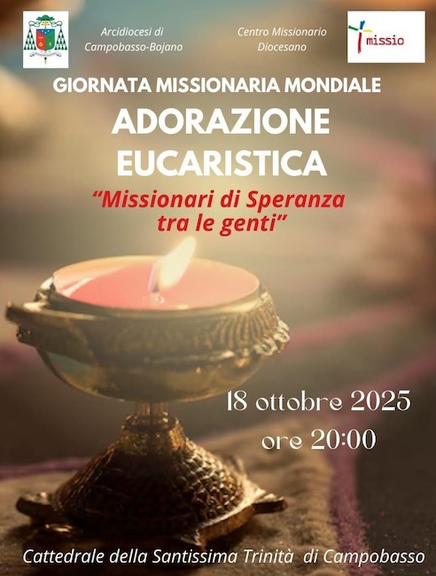 CAMPOBASSO – In occasione della 99ª Giornata Missionaria Mondiale, che si celebrerà domenica 19 ottobre 2025, l’Arcidiocesi di Campobasso-Bojano, insieme all’Ufficio Diocesano Pastorale Missionaria, invita tutta la comunità a un momento di intensa preghiera e comunione spirituale attraverso una Adorazione Eucaristica, che si terrà sabato 18 ottobre alle ore 20:00 presso la Cattedrale della Santissima Trinità di Campobasso.