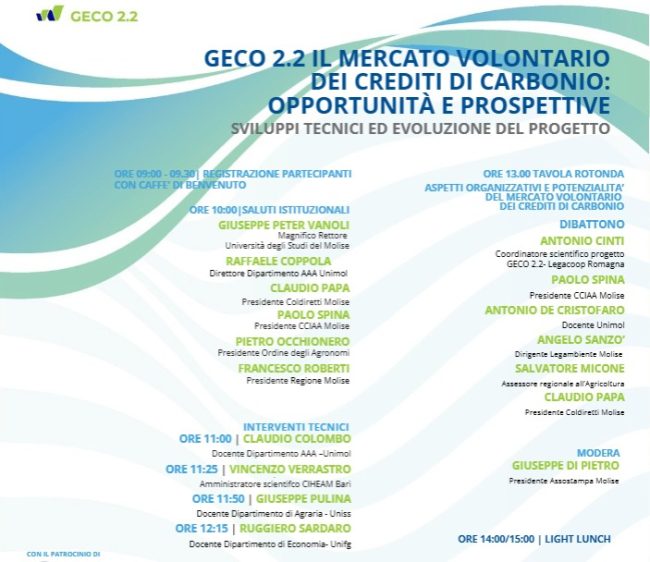 Finanziato dal Programma Interreg Italia-Croazia, “GECO 2.2” vede coinvolti: Coldiretti Molise, Legacoop Romagna e Ciheam Bari (partner associati rispettivamente delle Regioni Emilia Romagna e Puglia), Legacoop Marche, l’Agenzia per lo sviluppo rurale della contea di Zara (partner associato del Ministero dell’Agricoltura croato), la Regione di Dubrovnik Neretva e la OGAM (Associazione olivicoltori Mastrinka). Scopo del Progetto è quello di creare un mercato volontario dei crediti del carbonio in agricoltura fra le regioni adriatiche, promuovendo pratiche che migliorano il contento di carbonio nel suolo e nella biomassa, favorendo la resilienza delle aziende agricole da inondazioni e siccità. Il convegno, di rilevanza nazionale, vedrà la partecipazione di un parterre d’eccezione composto da personalità politiche e tecniche.