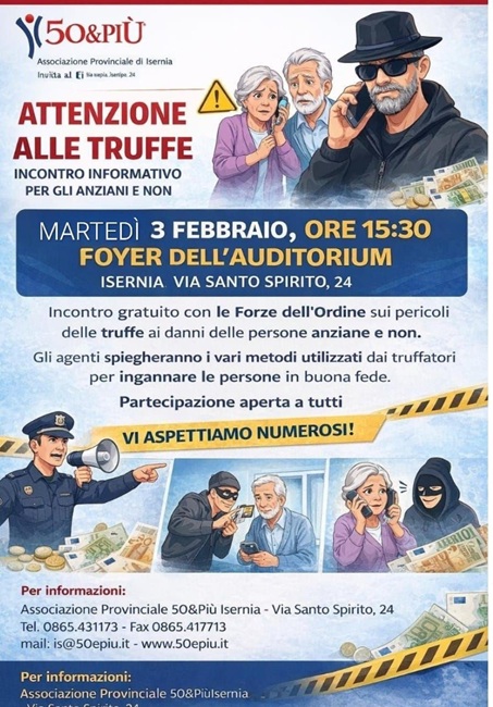 ISERNIA – La 50&Più Associazione Provinciale di Isernia organizza un importante incontro dedicato alla prevenzione delle truffe, un tema sempre più attuale che riguarda non solo gli anziani, ma l’intera comunità. L’appuntamento è fissato per martedì 3 febbraio alle ore 15:30, nel Foyer dell’Auditorium di Isernia, in via Santo Spirito 24.